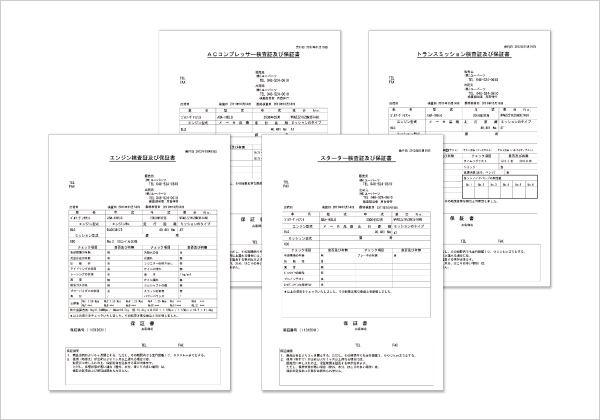 各部品の検査証、保証書を発行しています。今までの工程での検査内容です。また各商品には保証もついています。