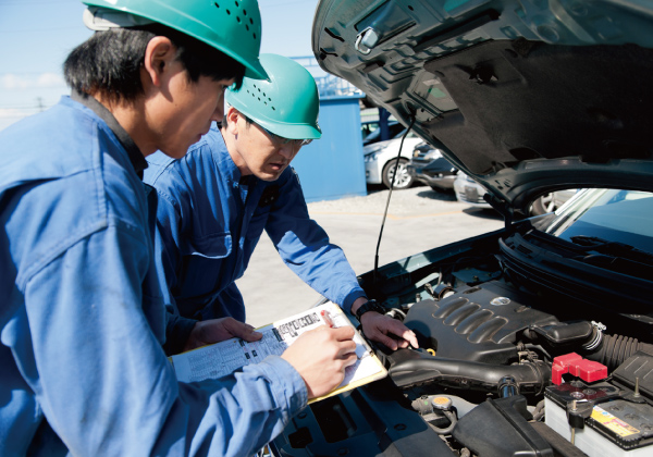 入庫した車両の装備品、損傷の程度をチェックします。豊富な販売実績データに基づき、取り外す部品の決定を行います。