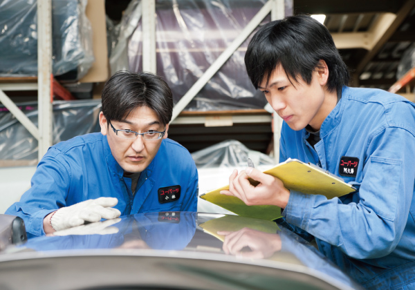 キズ、凹みなどのチェックを行います。熟練したスタッフによる目視、さらに手で触ることで、わずかな凹みも見逃しません。